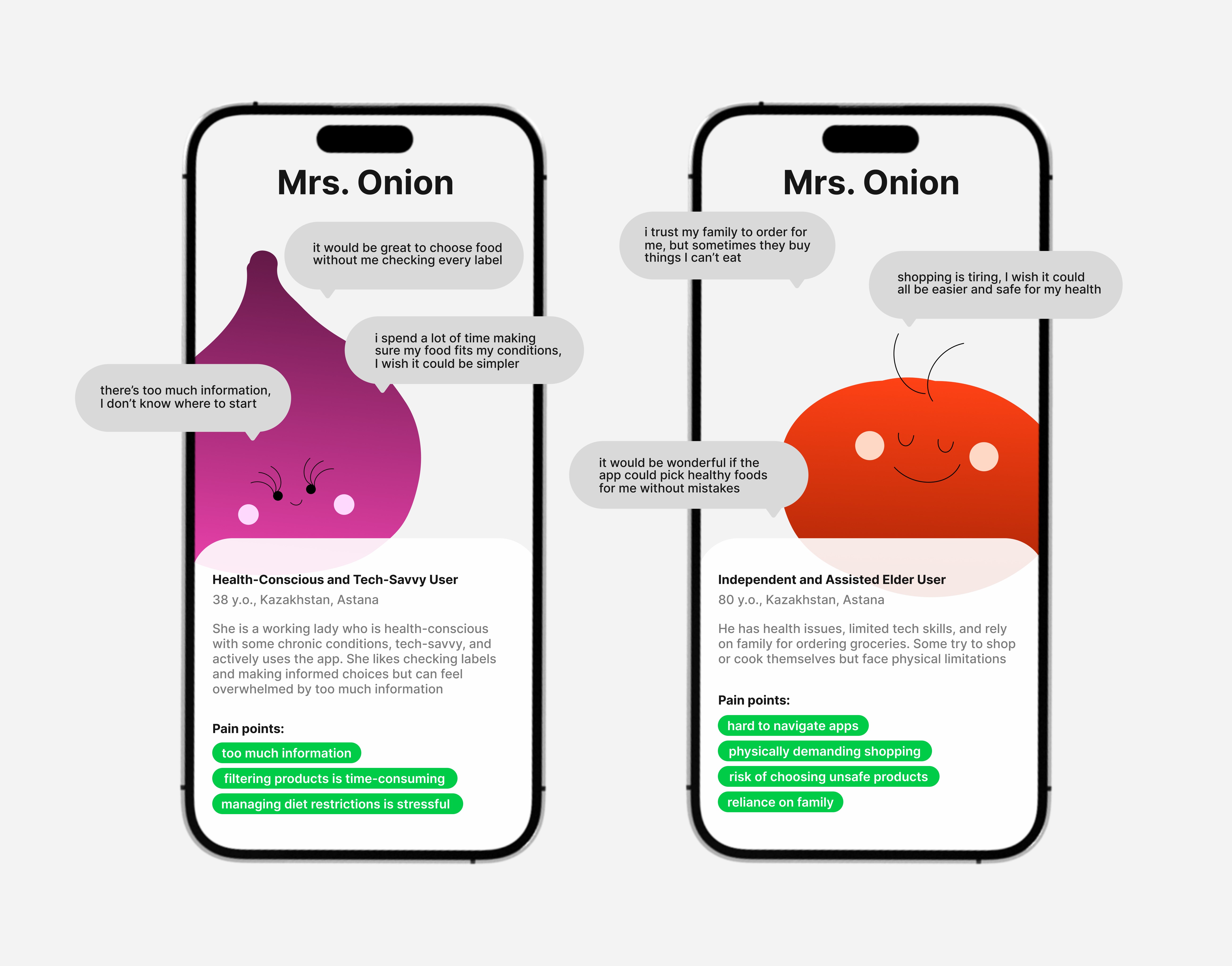 Arbuz.kz lacks health-aware product guidance and recurring delivery support, making grocery shopping difficult for both elderly users and younger people with health conditions, and time-consuming for caregivers managing orders on their behalf.