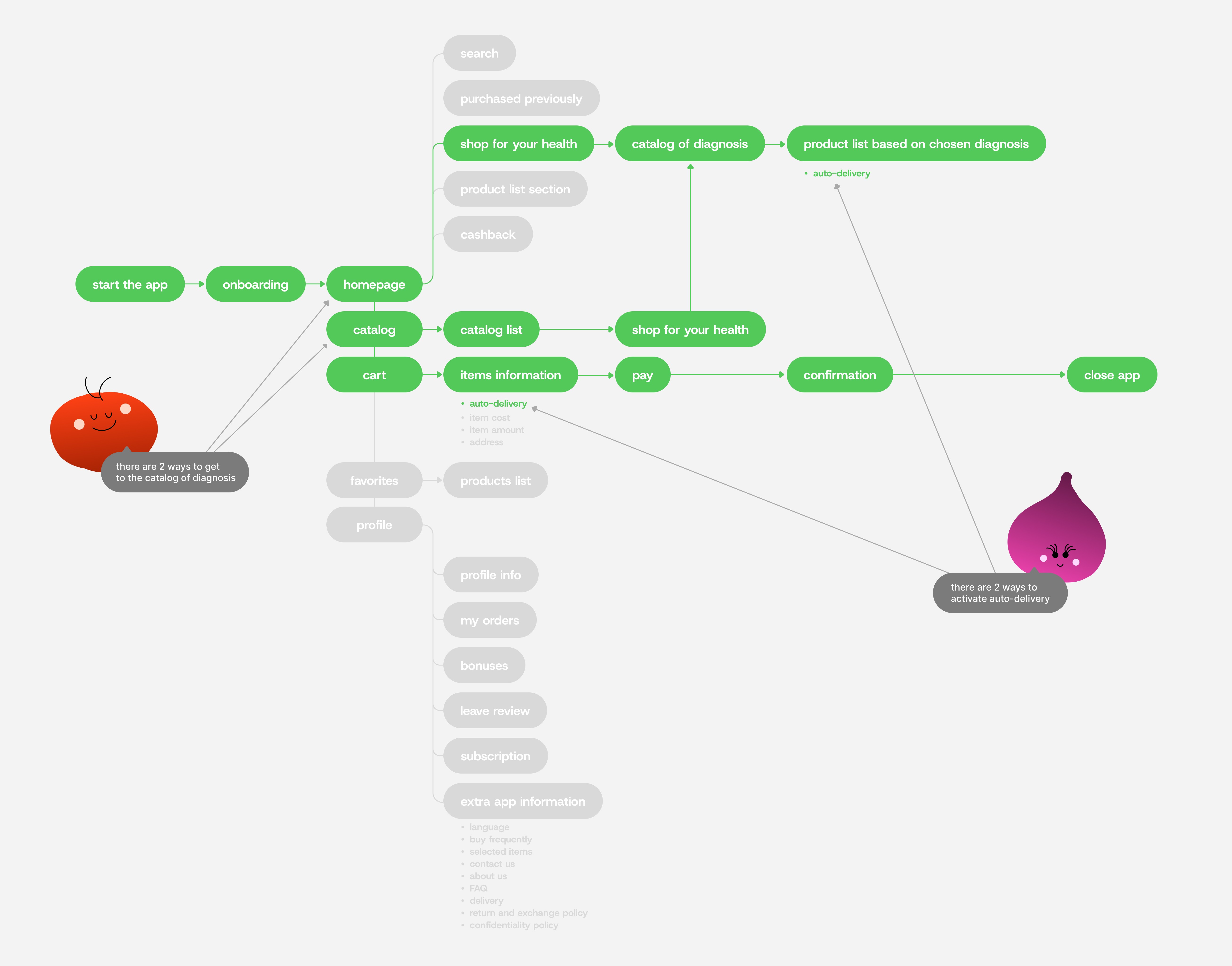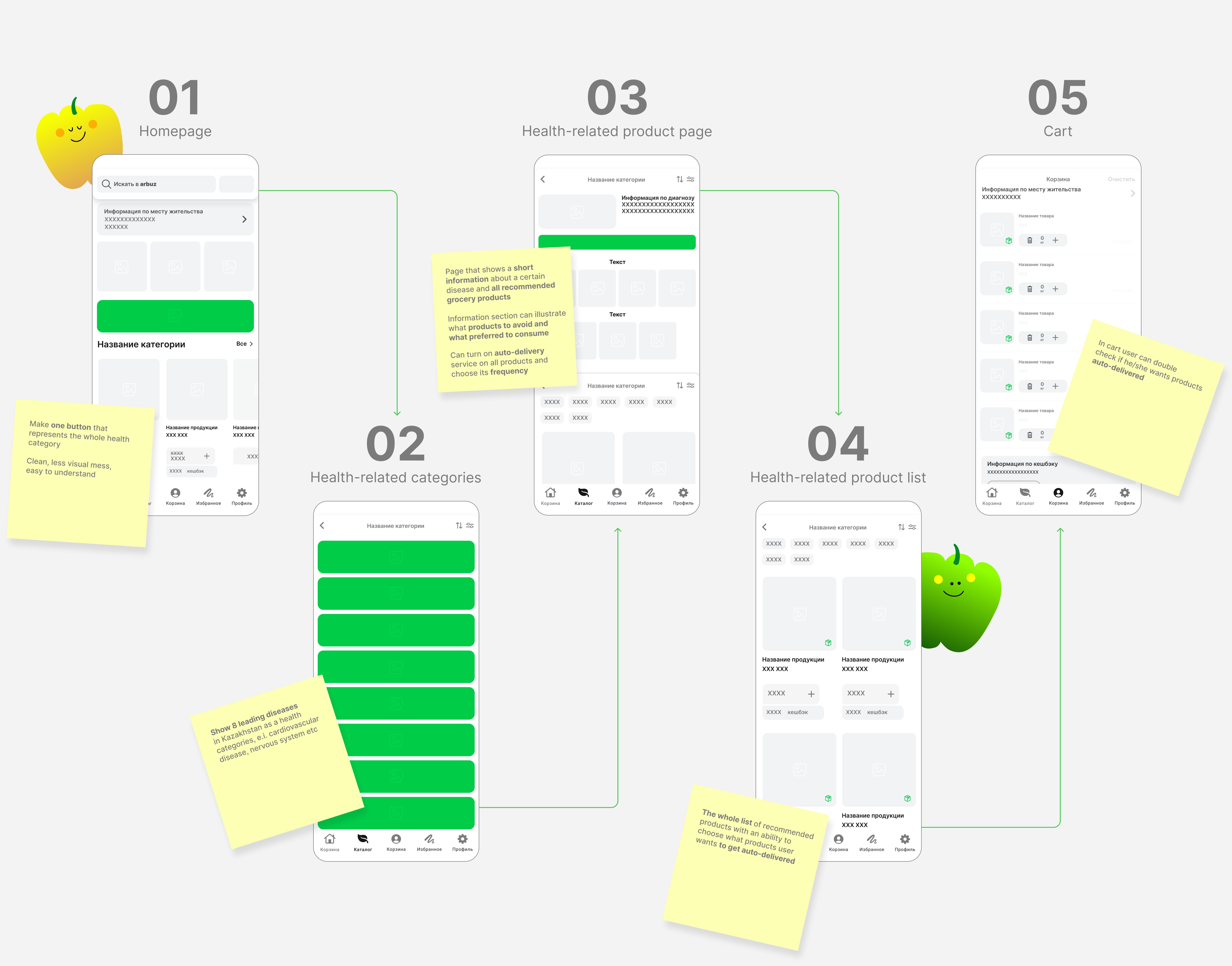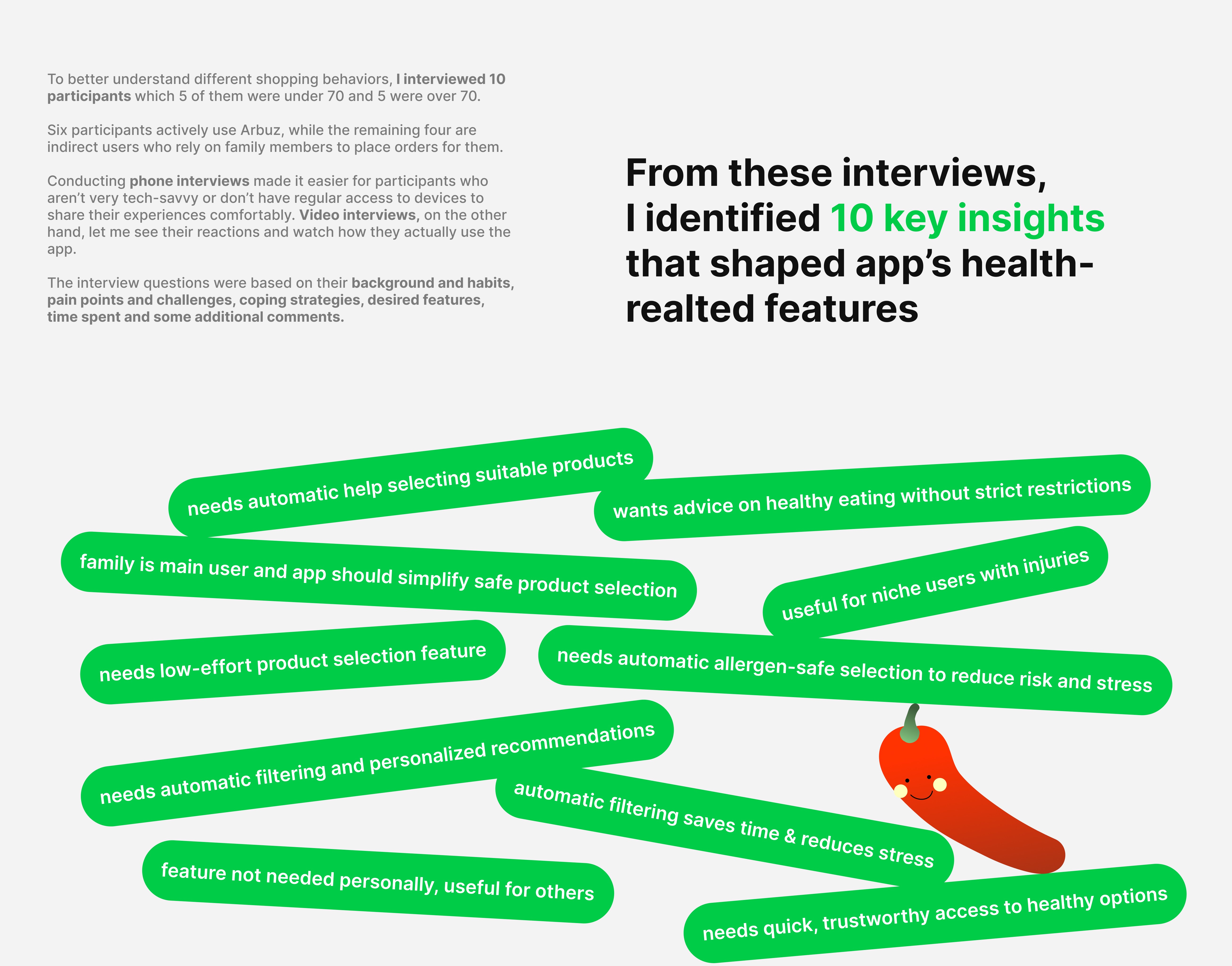 Enhancing Arbuz.kz App's daily experience through a health-focused recommendation and auto-delivery features conducting research and making prototype using Figma.