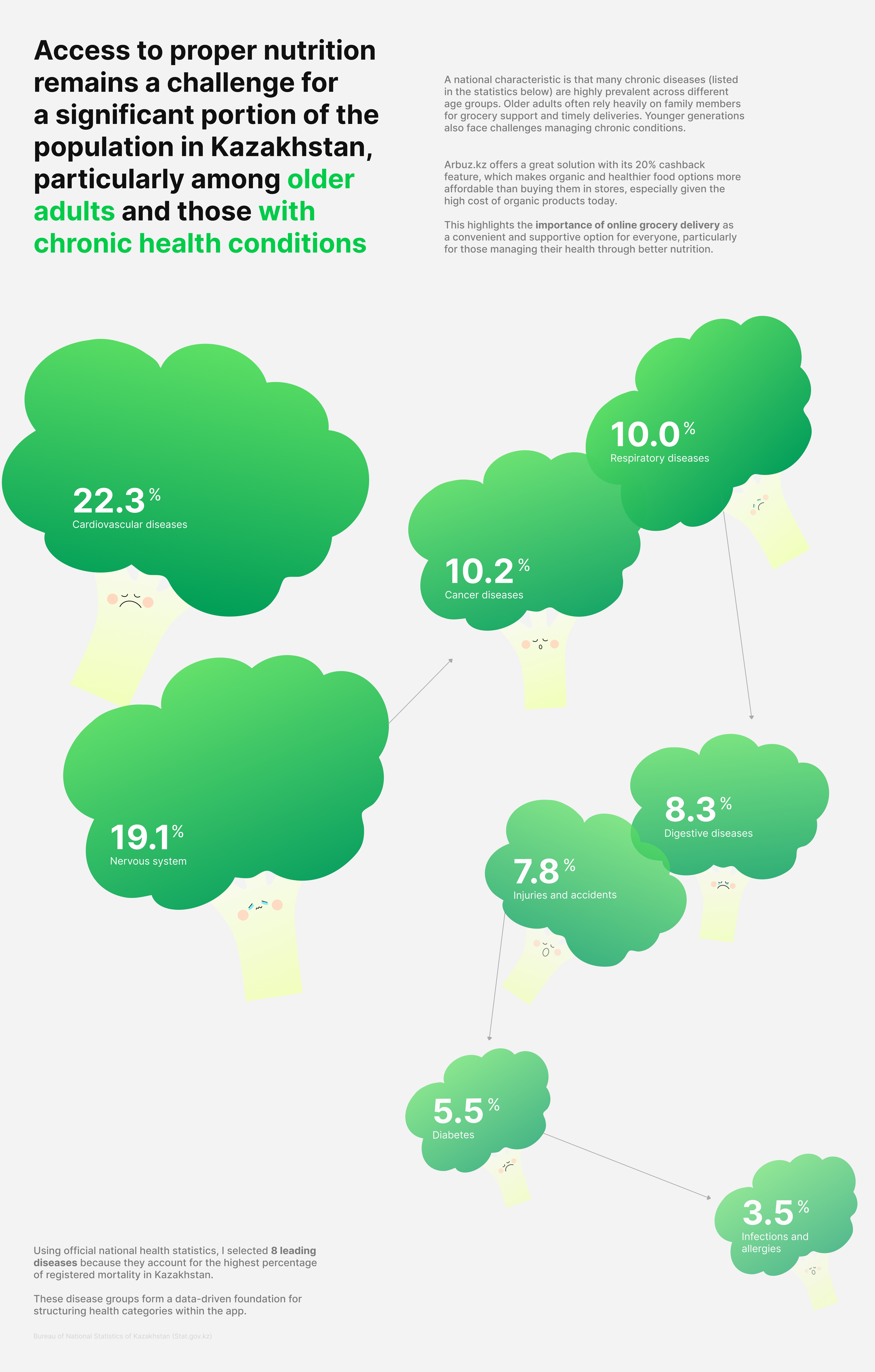 As a loyal user of arbuz.kz, I found myself wonder if the app could suggest me food based on my health condition and make it likewise for my grandparents.